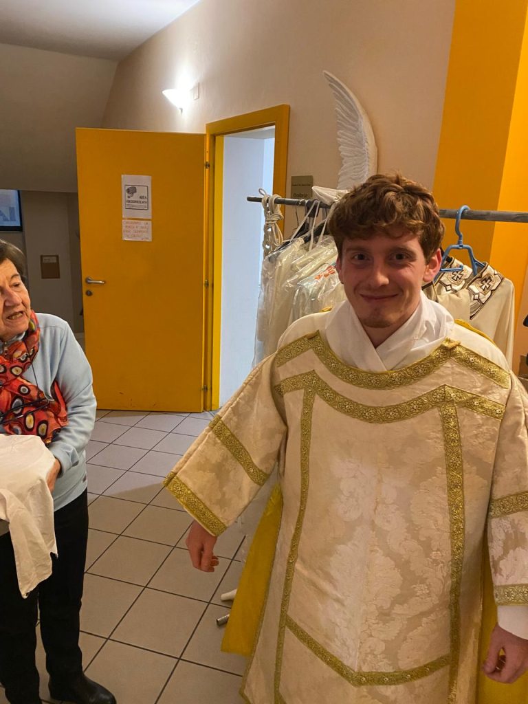 Essere chierichetto significa mettere a disposizione del parroco il proprio aiuto per rendere più fluide e solenni le funzioni religiose. Il chierichetto è una figura che dà la possibilità, durante la Messa, di avere un ruolo attivo. Io iniziai a fare il chierichetto in seconda elementare, cominciai perché per i miei genitori, con me e mio fratello affianco sulla panca che ci dimenavamo come serpi, era difficile seguire la celebrazione dal canto iniziale a quello finale. La maggior parte dei bambini fatica a seguire la Messa perché si annoia e non capisce i gesti che si fanno, per questo l’aiuto maggiore che ho ricevuto è stata la proposta di fare il chierichetto. Queste figure si distinguono rispetto alle altre che aiutano l’animazione della Messa perché si parano (indossare la veste bianca) e in qualche modo si avvicinano al prete. Mi sono sempre sentito fiero di aiutare direttamente il celebrante perché sentivo di far parte anche io alle Messe e provavo qualcosa di vivo dentro di me da quando indossavo la veste bianca in sacrestia, che tuttora non riesco a spiegare. Quando cominciai ero io che spingevo per arrivare in anticipo a Messa e non più i miei genitori che dovevano trascinarmi fuori di casa per arrivare quando il prete aveva già iniziato con l’atto penitenziale. L’ essere chierichetto aiuta a comprendere meglio i gesti, i simboli e tutto ciò che accompagna la liturgia della Parola. Non soltanto durante il tempo ordinario ma anche durante il tempo di Pasqua e di Natale. Intorno a questo ruolo durante la messa si è creato un bel gruppo di ragazzi che vengono a Messa con costanza e servono quando possibile. Secondo ciò che ho vissuto fino ad ora, credo che questo servizio che si fa per la comunità arricchisca la propria Fede e sia una testimonianza viva per tutte quelle persone meno coinvolte in una realtà parrocchiale.